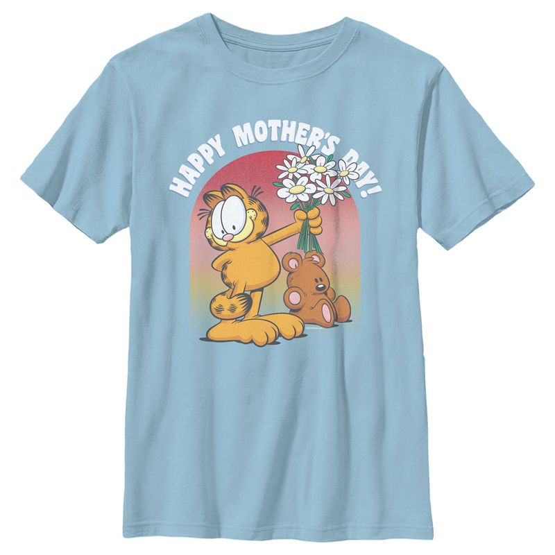 - احصل على شيء خاص لعيد الأم هذا مع هذا القميص الصبياني الذي يظهر غارفيلد اللطيف وهو يقدم باقة من الزهور مع عبارة: "عيد أم سعيد" فوقه!