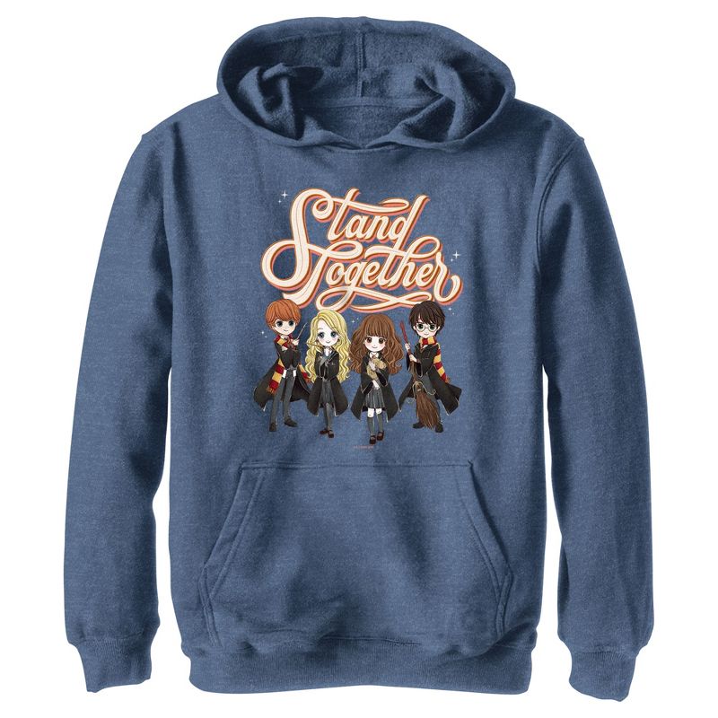 - تباهَ بإطلالة أنيقة مع هذا الهودي الجديد للأولاد، مثالي لجميع المناسبات! مزين برسومات رون، ولونا، وهيرميون، وهاري بأسلوب أنمي لطيف، أسفل عبارة "Stand Together" المكتوبة بأحرف بيضاء على الجهة الأمامية.