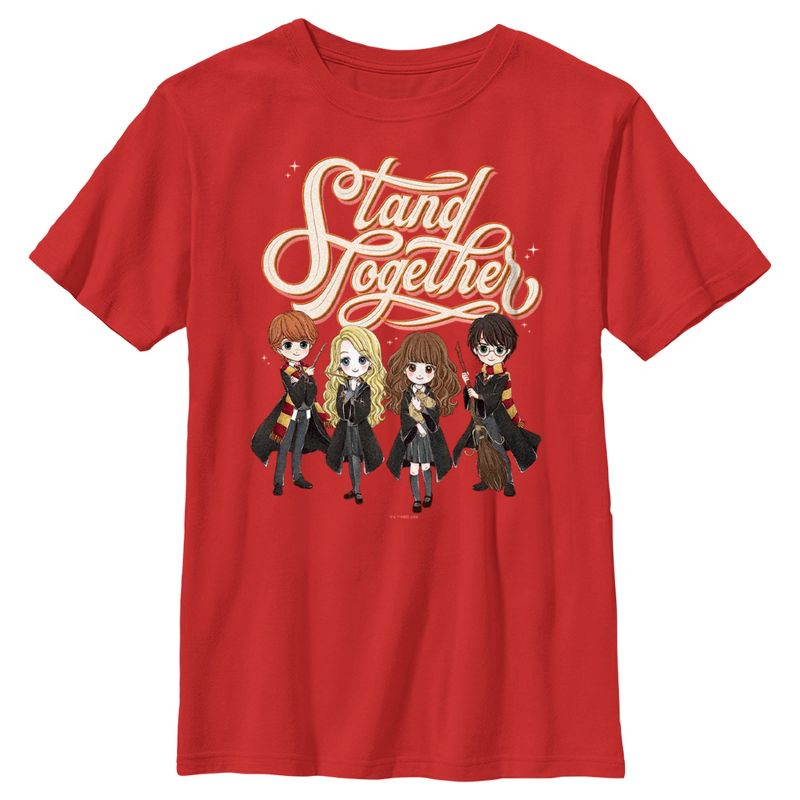 - أظهر مهاراتك مع هذا القميص الأنيق للأولاد والذي يتميز برسومات رائعة لرون ولونا وهيرميون وهاري بأسلوب رسوم متحركة رائع مع عبارة "Stand together" مطبوعة أعلاه!