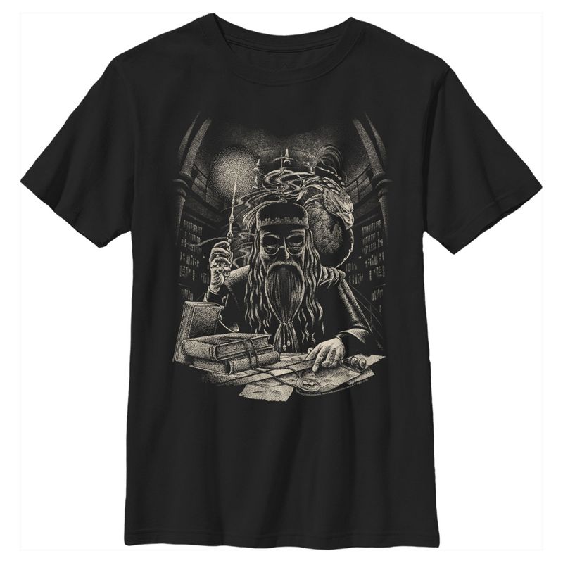 - تباهَ بأزيائكَ الأنيقة مع هذا التيشيرت الجديد للأولاد، مثالي لكل مناسبة! يحمل صورة دمبلدور بالأبيض والأسود وهو يقرأ في مكتبته.