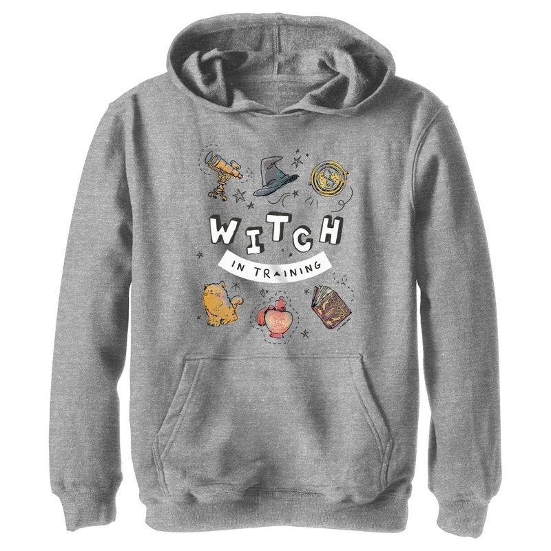 - تباهَ بملابسك الأنيقة مع هذا الهودي الجديد للأولاد، مثالي لجميع المناسبات! مطبوع عليه عبارة "Witch in Training" باللون الأبيض على الجهة الأمامية، محاطًا بأشياء مختلفة مثل التلسكوب والعطر وقبعة الساحرة!