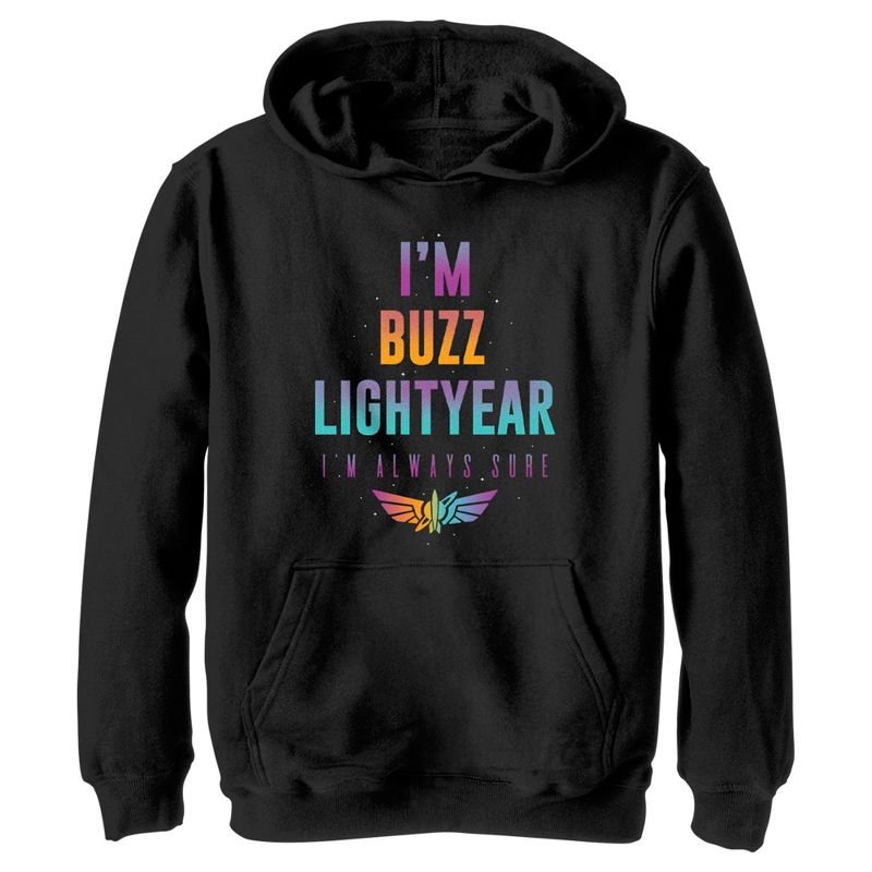 إلى ما لا نهاية! ارتقِ بأناقتك إلى آفاقٍ جديدة مع ملابس جديدة مرخصة رسميًا لجميع أفراد العائلة من فيلم لايت يير الجديد المرتقب، والذي يروي قصة باز لايت يير، بطل قصة لعبة المحبوب! يحمل هذا الهودي للأولاد عبارة "أنا باز لايت يير، أنا متأكد دائمًا" بأحرف كبيرة ملونة.