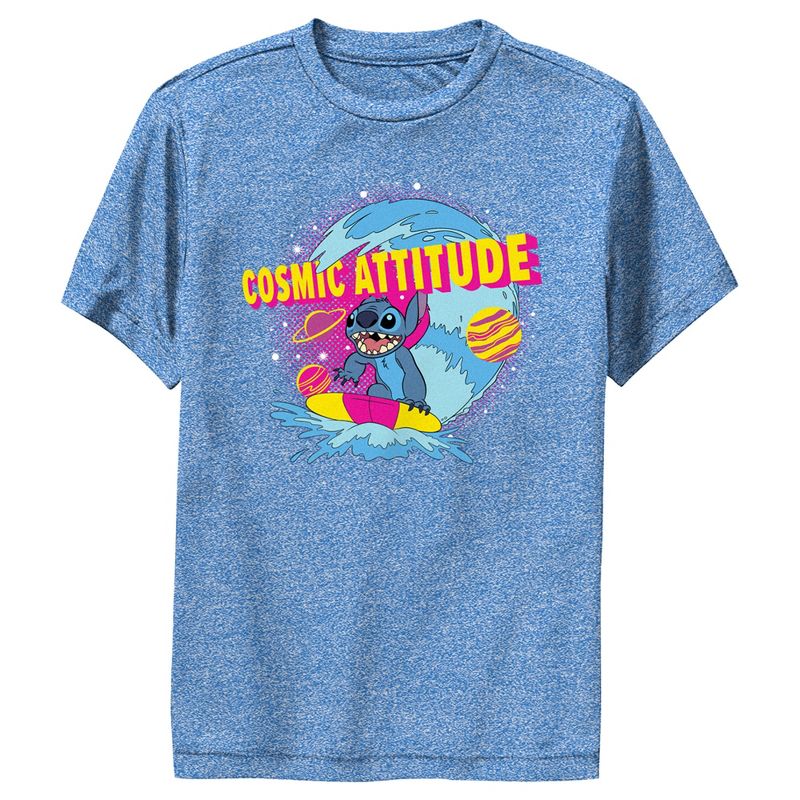 - تباهَ بجمالك مع هذا التيشيرت الجديد الأنيق للأولاد، مثالي لجميع المناسبات! يتميز برسومات ستيتش وهو يركب الأمواج، وعبارة "Cosmic Attitude" (الموقف الكوني)، وكواكب ملونة، وخلفية وردية نصفية اللون.