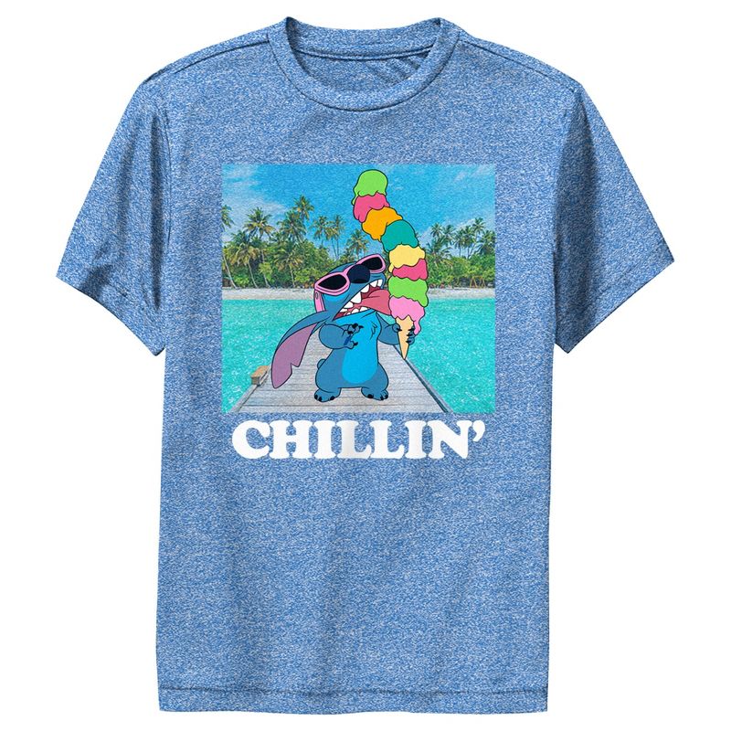 - تباهَ بأزيائكَ الأنيقة مع هذا التيشيرت الجديد للأولاد، مثالي لجميع المناسبات! يُظهر ستيتش وهو يستمتع بمخروط آيس كريم لذيذ، ومنظرًا لمناظر طبيعية استوائية، وكلمة "Chillin'" مطبوعة بأحرف بيضاء أسفله.