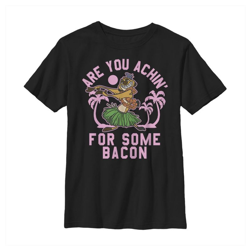 قد يعشق تيمون اليرقات، لكن هذا لا يعني أنه لا يُقدّر حبك للحم المقدد أيضًا على تيشيرت "تيمون الملك، أتشوق للحم المقدد" للأولاد! يرقص تيمون رقصة الهولا على هذا التيشيرت المرح بطبعة "الأسد الملك"، والمطبوع عليه عبارة "هل أنت متشوق لبعض اللحم المقدد؟".