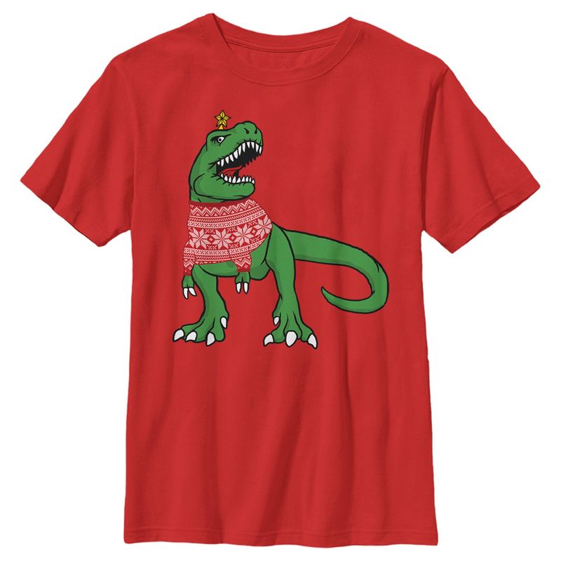 - تباهَ بملابسك الأنيقة مع هذا التيشيرت الجديد للأولاد، مثالي لأعياد الميلاد! يتميز بتصميم تي ريكس بنجمة على رأسه، تمامًا مثل شجرة عيد الميلاد، ويرتدي سترة عيد ميلاد قبيحة من الأمام.