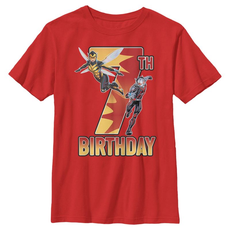 - انطلق في مغامرة عيد ميلاد رائعة مع هذا التيشيرت الجديد والأنيق للأولاد! يتميز برسومات الرجل النملة والدبورة وهما يقفزان، و"عيد ميلاد السابع" مطبوعًا بأحرف رائعة مستوحاة من القصص المصورة على الجهة الأمامية.
