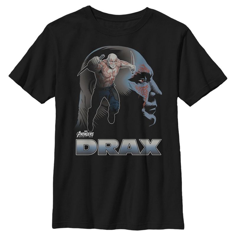 دراكس شخصيةٌ حقيقيةٌ جدًا... وهو يعشق تيشيرت دراكس بورتريه للأولاد من مارفل أفينجرز: إنفينيتي وور. يظهر دراكس، حارس المجرة الأكثر واقعيةً، ممسكًا بسكاكينه الشهيرة مستعدًا للانطلاق، إلى جانب صورته الجانبية في الخلفية، بينما يُطبع اسمه "دراكس" بأحرف كبيرة وواضحة أسفله. مصير الكوكب ومصير خزانة ملابسك يعتمدان على اتحاد أبطال مارفل المفضلين لديك لإنقاذ العالم!