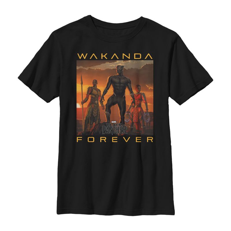 لطالما بحث الناس عن جنة واكاندا الخفية، لكن تيشيرت مارفل بلاك بانثر 2018 "واكاندا للأبد" للأولاد هو ما يرغبون بشدة في اقتنائه! يقف بلاك بانثر وأوكوي وناكيا خلفهم، وخلفهم غروب الشمس، وكلمة "واكاندا للأبد" مكتوبة على هذا التيشيرت الرائع للشباب.