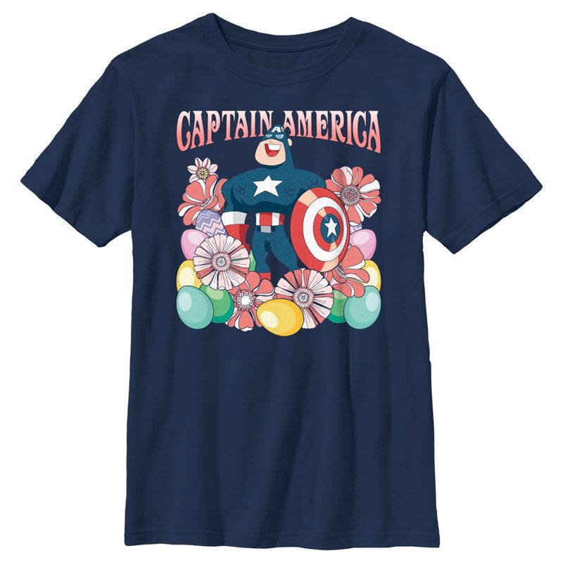 - احصل على سلة وانطلق في رحلة بحث عن تيشيرت عيد الفصح للأولاد! مزين بكابتن أمريكا محاطًا بالزهور والبيض المزين.