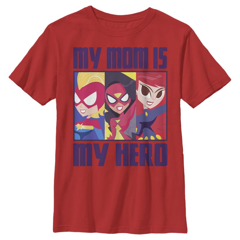 - احصلي على شيء مميز لعيد الأم هذا مع هذا القميص النسائي الذي يحمل صور الأرملة السوداء، والكابتن مارفل، وسبايدرمان، محاطة بعبارة "أمي هي بطلتي" بأحرف أرجوانية على الجهة الأمامية.