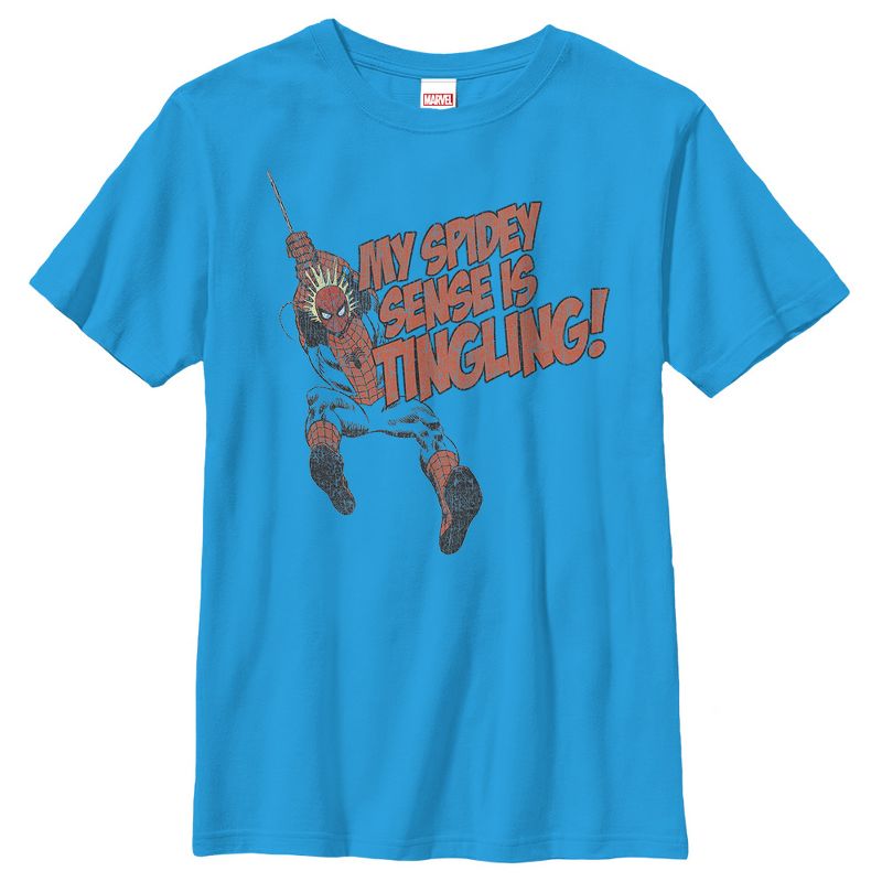 لن تتمكن أبدًا من التسلل إلى بيتر باركر لأنه يستشعر قدومك بقميص سبايدرمان "حاسة العنكبوت" الفيروزي من مارفل. يتميز سبايدرمان بطبعة باهتة، وبجانبه عبارة "حاسة العنكبوت تُثير الوخز!" على مقدمة هذا القميص الكلاسيكي.