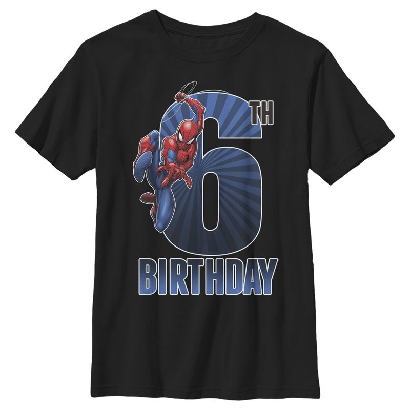 - انطلق في مغامرة عيد ميلاد رائعة مع هذا التيشيرت الجديد والأنيق للأولاد! يتميز برسم سبايدرمان وهو يستعرض قدراته العنكبوتية وهو يتأرجح على شبكته الأمامية، بالإضافة إلى عبارة "عيد ميلاده السادس" مطبوعة بأحرف زرقاء.