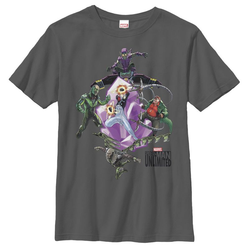 استعد للقتال ضد أعداء سبايدرمان اللدودين مع تيشيرت مارفل سبايدرمان أنليميتد فيلينز الرمادي الفحمي. يظهر على هذا القميص الرمادي بعضٌ من ألد أعداء سبايدرمان، مثل غرين غوبلن ودكتور أوكتوبس.