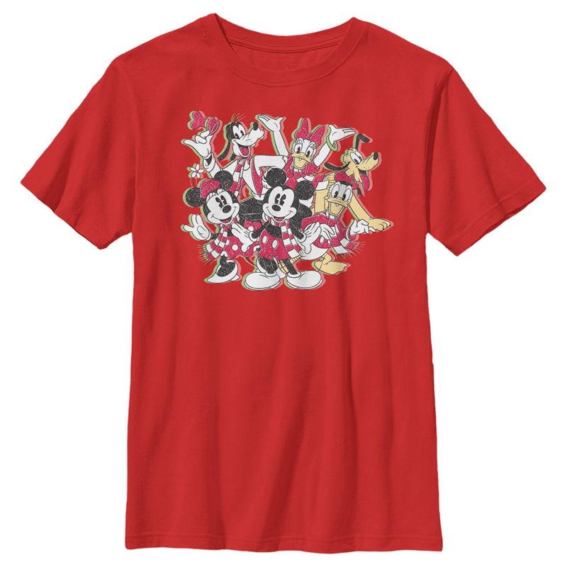 - تباهَ بملابسك الأنيقة مع هذا التيشيرت الجديد للأولاد، مثالي لموسم الأعياد! مزين برسومات ميكي ماوس، وميني ماوس، ودونالد داك، وديزي داك، وغوفي، وبلوتو، وهم يرتدون أوشحة مخططة بالأحمر والأبيض على الجهة الأمامية.