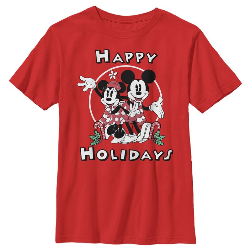 - تباهَ بأزيائكَ الأنيقة مع هذا التيشيرت الجديد للأولاد، مثالي لموسم الأعياد! يتميز برسومات ميني ماوس وميكي ماوس الكلاسيكية، مع عبارة "أعياد سعيدة" على الجهة الأمامية.