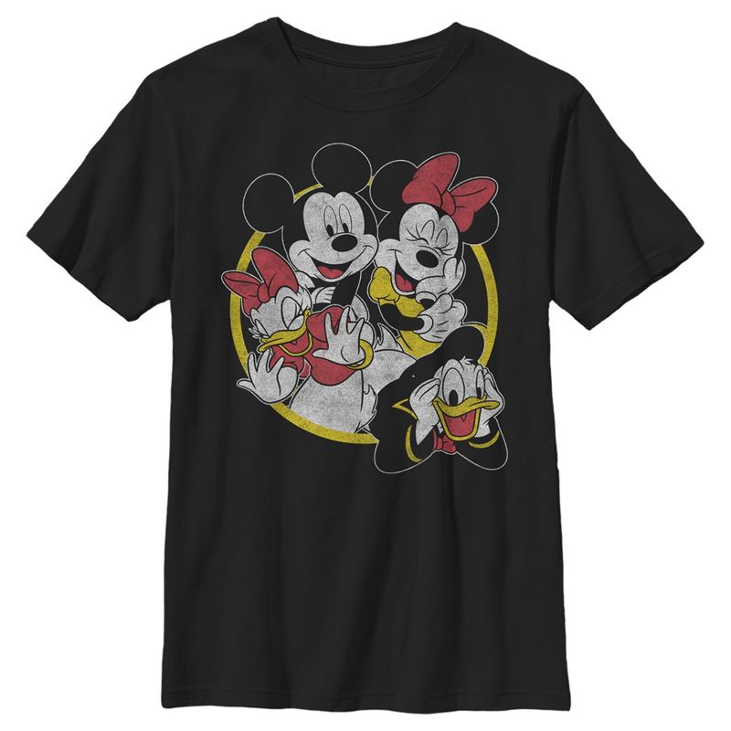 - تباهَ بأزيائكَ الأنيقة مع هذا التيشيرت الجديد للأولاد، مثالي لجميع المناسبات! يتميز برسمٍ مُهترئ لميكي ماوس، وميني ماوس، وديزي داك، ودونالد داك، مُؤطَّر داخل دائرة على الجهة الأمامية.