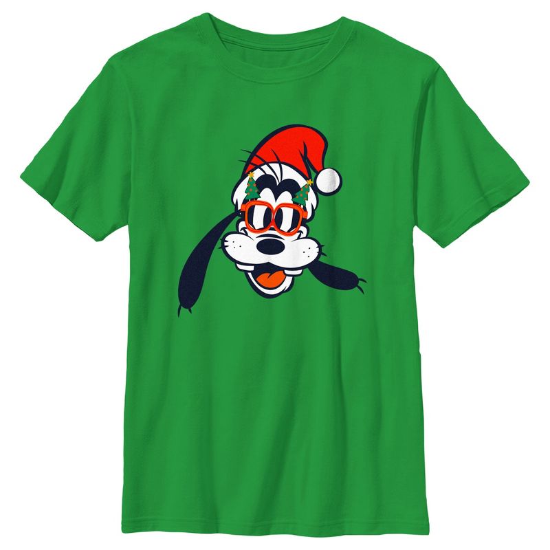 - تباهَ بملابسك مع هذا التيشيرت الجديد والأنيق للأولاد، مثالي لموسم الأعياد! يُظهر غوفي مرتديًا قبعة سانتا ونظارات، مع أشجار عيد الميلاد على الجهة الأمامية.