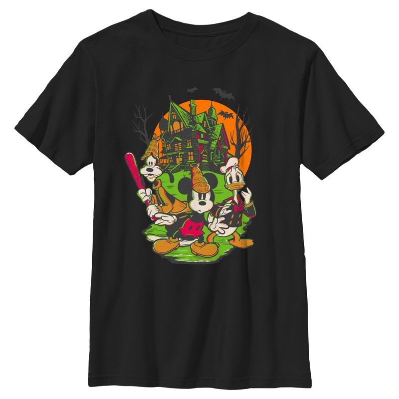 - ما هذا الصوت الذي يُصدر ضجيجًا في الليل ويُصدر قعقعة في خزانتك؟ إنه قميص الهالوين المُرعب للأولاد، والذي يُظهر ميكي ماوس ودونالد دك وغوفي في هيئة محققين، مع قصر مسكون في الخلفية.