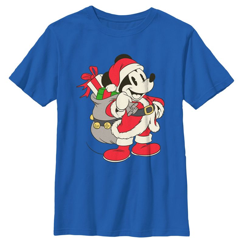 - تباهَ بإطلالة مميزة مع هذا التيشيرت الجديد والأنيق للأولاد، مثالي لموسم الأعياد! يحمل صورة ميكي ماوس وهو يحمل كيس هدايا، مرتديًا زي بابا نويل.
