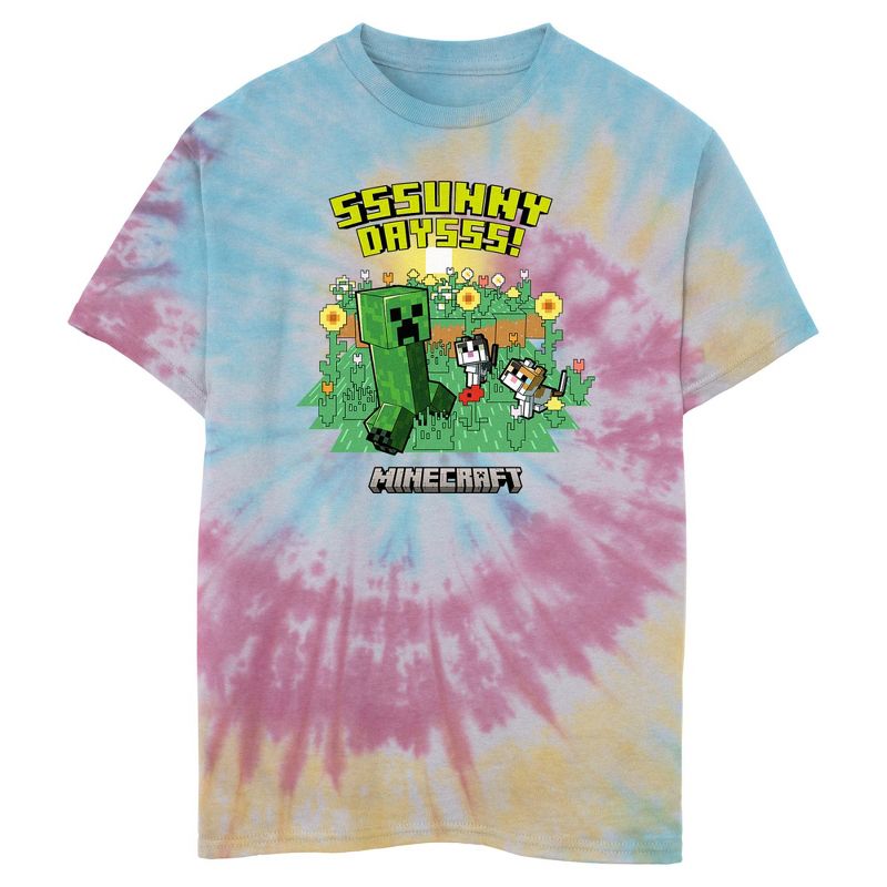 - يا له من يوم ربيعي مميز ستقضيه مع هذا التيشيرت الجديد الأنيق للأولاد، والمُصمم بتقنية الصباغة بالربط! يتميز برسومات كريبر معلقة مع قطتين جميلتين، محاطتين بالزهور، وعبارة "أيام مشمسة!" المبهجة، وشعار ماين كرافت الشهير.