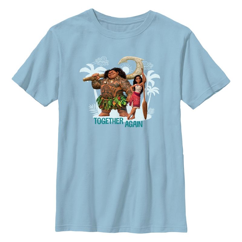 - تباهَ بجمالك مع هذا التيشيرت الجديد والأنيق للأولاد، مثالي لجميع المناسبات! يتميز برسمٍ رائع لموانا وماوي محاطين بزينة أشجار النخيل، مع عبارة "معًا من جديد" مطبوعة أسفله.