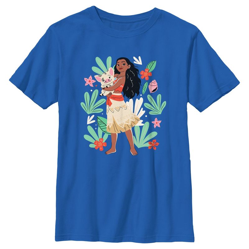 - تباهَ بجمالك مع هذا التيشيرت الجديد الأنيق للأولاد، مثالي لجميع المناسبات! يُصوّر موانا واقفةً بشموخ وهي تحمل بوا بين ذراعيها، محاطةً بالنباتات الاستوائية والزهور والأصداف البحرية من الأمام.