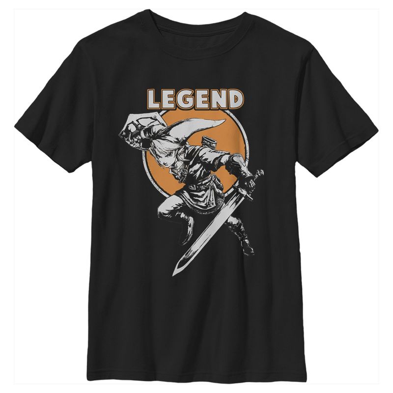 لن تكتمل رحلة أي بطل بدون تيشيرت "لينك هيرو" للأولاد من نينتندو ليجند أوف زيلدا! طبعة رمادية وبرتقالية على واجهة هذا التيشيرت العتيق الباهت تُظهر لينك ممسكًا بسيف السيد ودرع هيليان، وكلمة "أسطورة" مطبوعة فوقه.