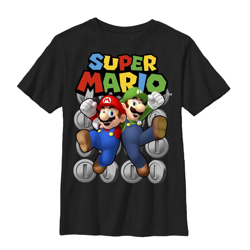 يظهر أشهر سباكين على تيشيرت فريق نينتندو ماريو بروس الأسود. يُطلق كل من ماريو ولويجي ركلةً نصرًا على مقدمة هذا التيشيرت الشبابي المتين، مع عملات معدنية خلفهما وشعار سوبر ماريو أعلاه.