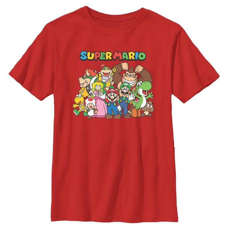 اصطحب أصدقاء ألعاب الفيديو المفضلين لديك أينما ذهبت مع تيشيرت نينتندو ماريو الأحمر! مطبوع عليه شعار سوبر ماريو، ماريو، الأميرة بيتش، تود، دونكي كونج، يوشي، وغيرهم الكثير.