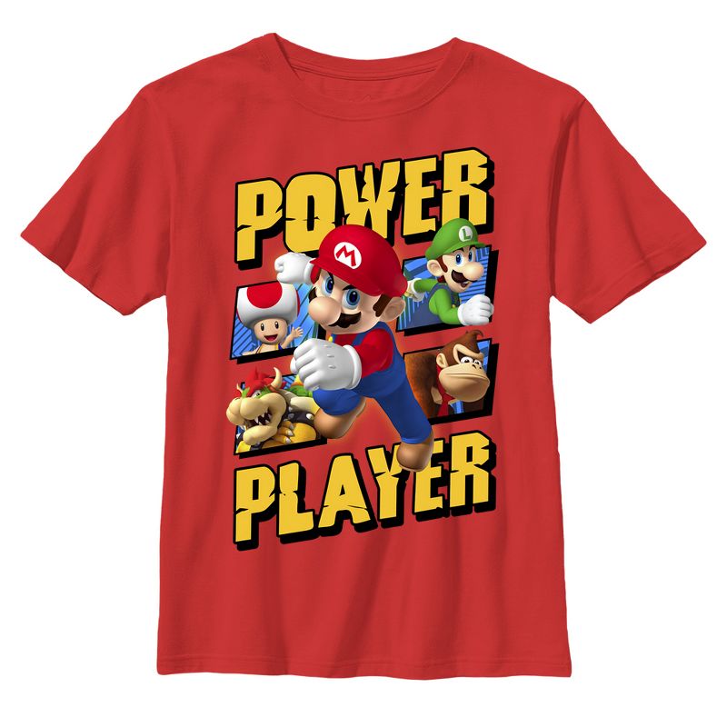 العب مع ماريو وأصدقائه بقميص نينتندو ماريو باور بلايرز الأحمر. يظهر ماريو، لويجي، دونكي كونج، باوزر، وتود على هذا القميص الأحمر المتين للشباب، مطبوع عليه عبارة "باور بلايرز" حولهم.