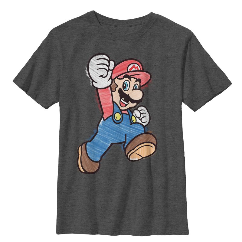 سبايني، بو، وحتى باوزر نفسه، لا يضاهون تيشيرت نينتندو ماركر ماريو هيذر الفحمي. يقفز ماريو، بأسلوب كتاب التلوين، على واجهة هذا التيشيرت الجرافيكي من نينتندو، متخذًا إحدى وضعياته التقليدية، احتفالًا بألعاب الفيديو الكلاسيكية.