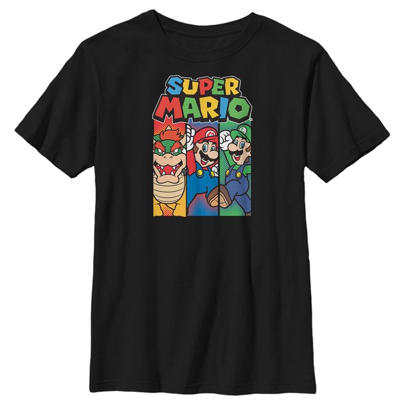 بعضٌ من شخصيات ألعاب الفيديو المفضلة لديكم تتباهى بقميص نينتندو سوبر ماريو باوزر المخطط الأسود. يظهر ماريو ولويجي وباوزر أمام خطوط زاهية الألوان على قميص شبابي أسود متين.