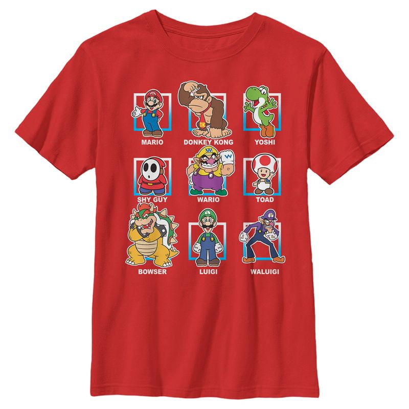 - تباهَ بجمالك مع هذا التيشيرت الجديد الأنيق للأولاد، مثالي لجميع المناسبات! يحمل صور ماريو، دونكي كونج، يوشي، شاي جاي، واريو، تود، باوزر، لويجي، ووالويجي، داخل إطارات مربعة.