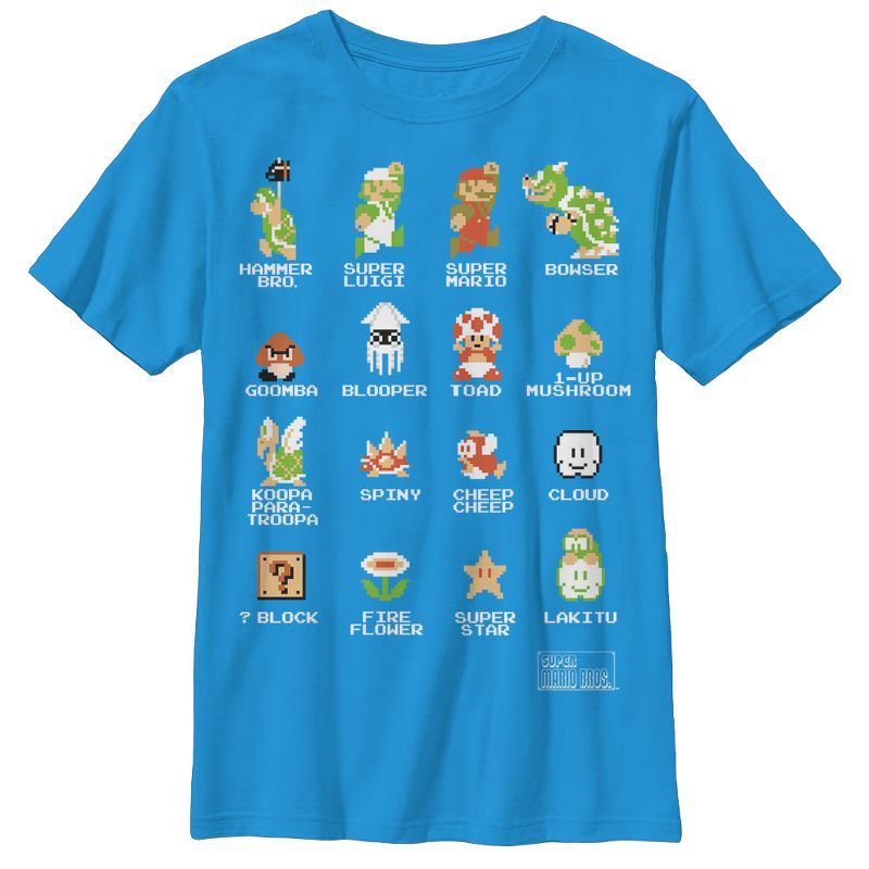 من ماريو إلى تود وباوزر، جميع شخصياتك المفضلة من سلسلة ماريو جاهزة للتألق على تيشيرت نينتندو سوبر ماريو بروس بيكسل كاست مع أسماء باللون الفيروزي. يظهر طاقم بيكسل من سوبر ماريو بروس بكامل أناقته على واجهة هذا التيشيرت الفيروزي الرائع.