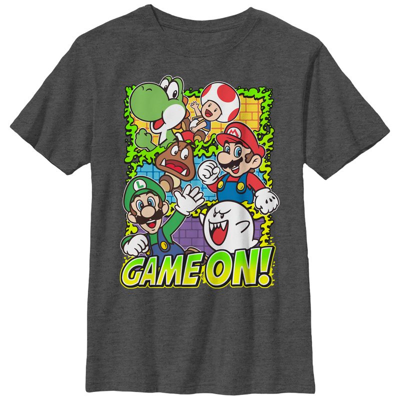 باوزر وكووبا تروبا لا يملكان أي فرصة للفوز على تي شيرت هيذر الفحمي من نينتندو سوبر ماريو! يوشي، تود، ماريو، لويجي، وبو مطبوع عليهم جميعًا "Game On!" على مقدمة هذا القميص الرائع للأولاد من ماريو.