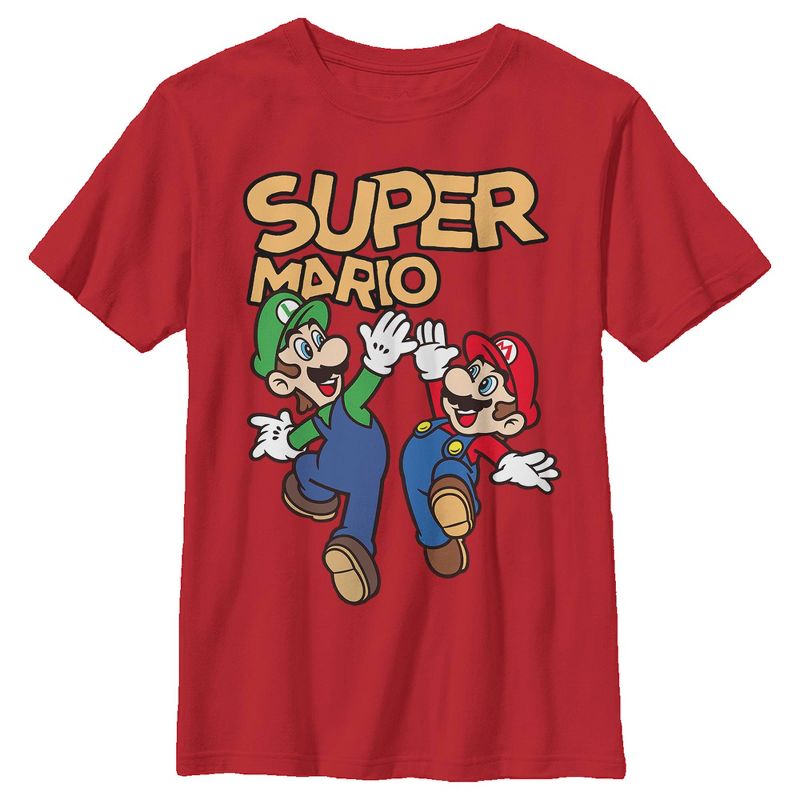 - تباهَ بملابسك مع هذا التيشيرت الجديد الأنيق للأولاد، مثالي لجميع المناسبات! يتميز برسومات كلاسيكية لماريو ولويجي وهما يتبادلان التحية، وفوقهما عبارة "سوبر ماريو".