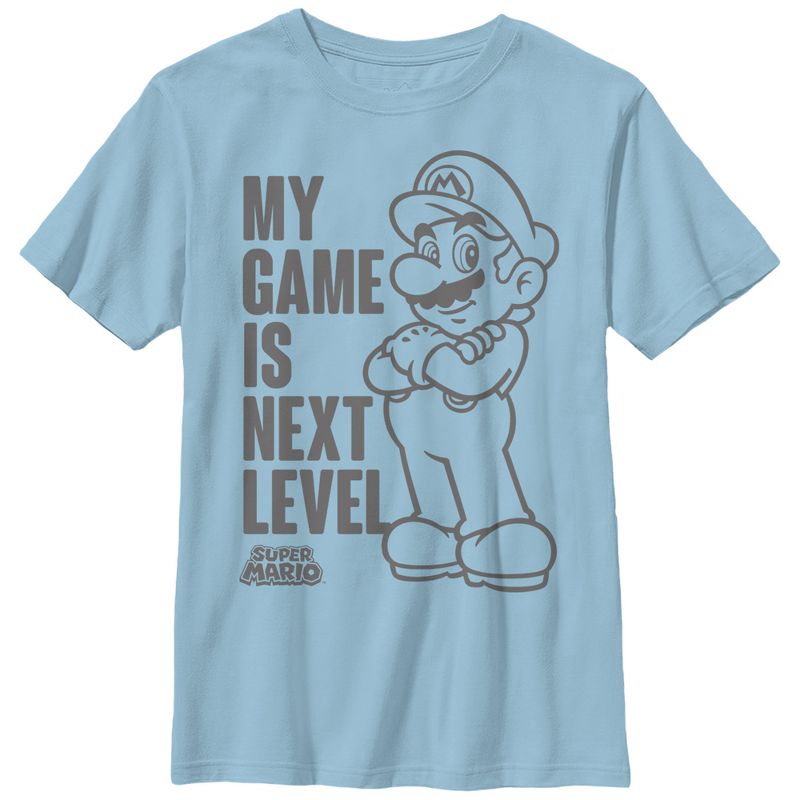 ارتقِ بأسلوب لعبك مع تيشيرت نينتندو سوبر ماريو "لعبتي هي المستوى التالي" الأزرق الفاتح! طبعة رمادية على مقدمة هذا القميص الأزرق الرائع من سوبر ماريو تحمل عبارة "لعبتي هي المستوى التالي" بجوار صورة ماريو واقفًا وذراعيه متقاطعتان.