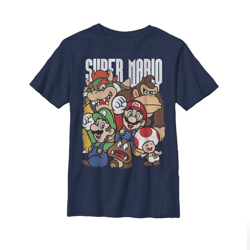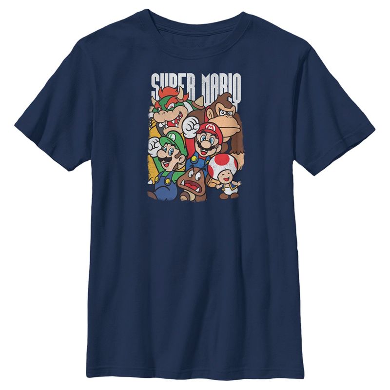 جميع أفراد العصابة هنا، وهم مستعدون لكسب بعض النقاط مع تيشيرت نينتندو سوبر ماريو بارتي الأزرق الداكن! مطبوعات دونكي كونج، باوزر، لويجي، ماريو، تود، وغومبا في كولاج باهت على واجهة هذا التيشيرت الأزرق الكلاسيكي للأولاد من نينتندو.