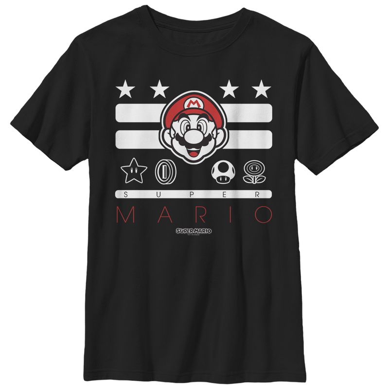 اجمع كل ما تستطيع من نقاط مع تيشيرت نينتندو سوبر ماريو باور أب الأسود. مطبوع عليه صورة ماريو مبتسمًا فوق عملة معدنية، وزهرة، ونجمة، وفطر ون أب.