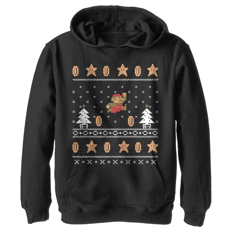 استمتع بأجواء العيد مع هذا السترة الصوفية القبيحة للأولاد من نينتندو ماريو كوين! افتح عدداً من مجلة نينتندو باور، وأدخل رمز الغش، واستمتع بحياة لا نهائية، واحصل على كوب من الكاكاو، وكن رائعاً!