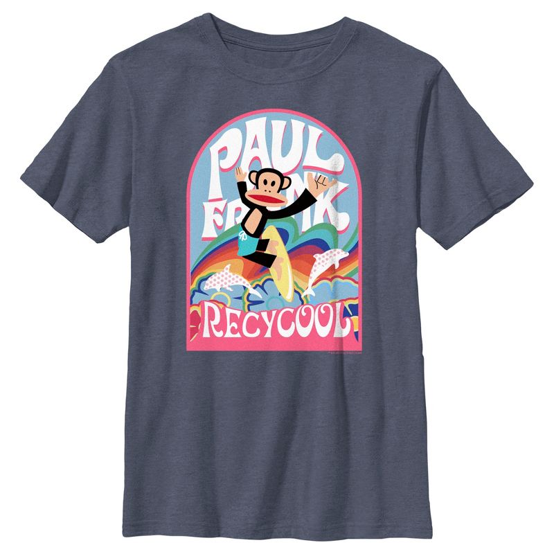 - تباهَ بإطلالة مميزة مع هذا التيشيرت الجديد والأنيق للأولاد، مثالي لموسم الربيع! يتميز بتصميم مستوحى من أسلوب جوليوس القرد وهو يركب الأمواج بجانب الدلافين، مع اسم العلامة التجارية وعبارة "Recycool" مطبوعة على الجهة الأمامية.