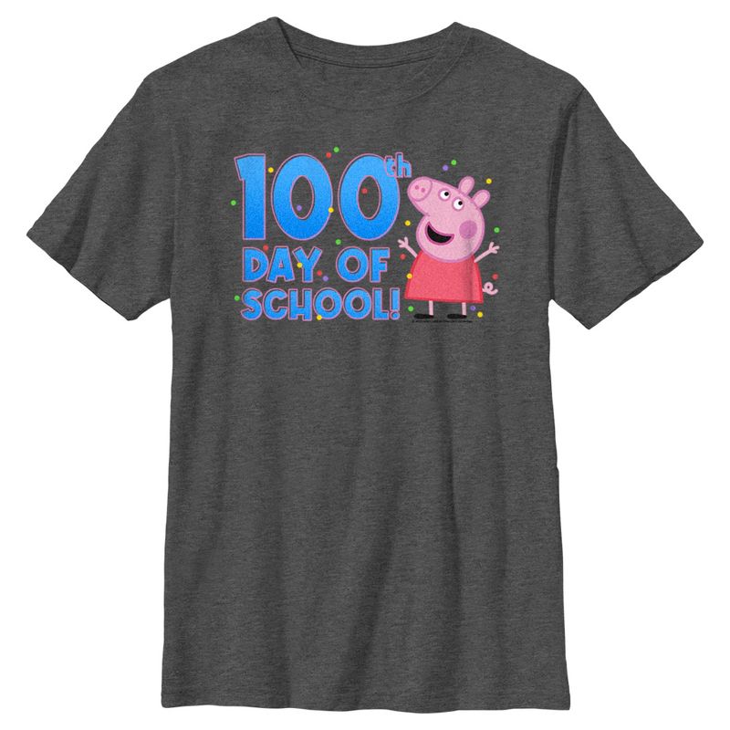 - تباهَ بأزيائكَ الأنيقة مع هذا التيشيرت الجديد للأولاد، مثالي لجميع المناسبات! يحمل صورة بيبا بيغ مع عبارة "اليوم الـ ١٠٠ من المدرسة" ودوائر ملونة في الخلفية.