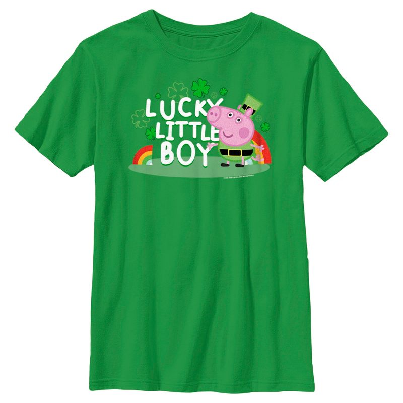- تباهَ بملابسك الأنيقة مع هذا التيشيرت الجديد للأولاد، مثالي لعيد القديس باتريك! يُزيّنه جورج بيج بزيّ العفريت، مع أوراق الشامروك وأقواس قزح وطبعة "الولد الصغير المحظوظ" في المنتصف.