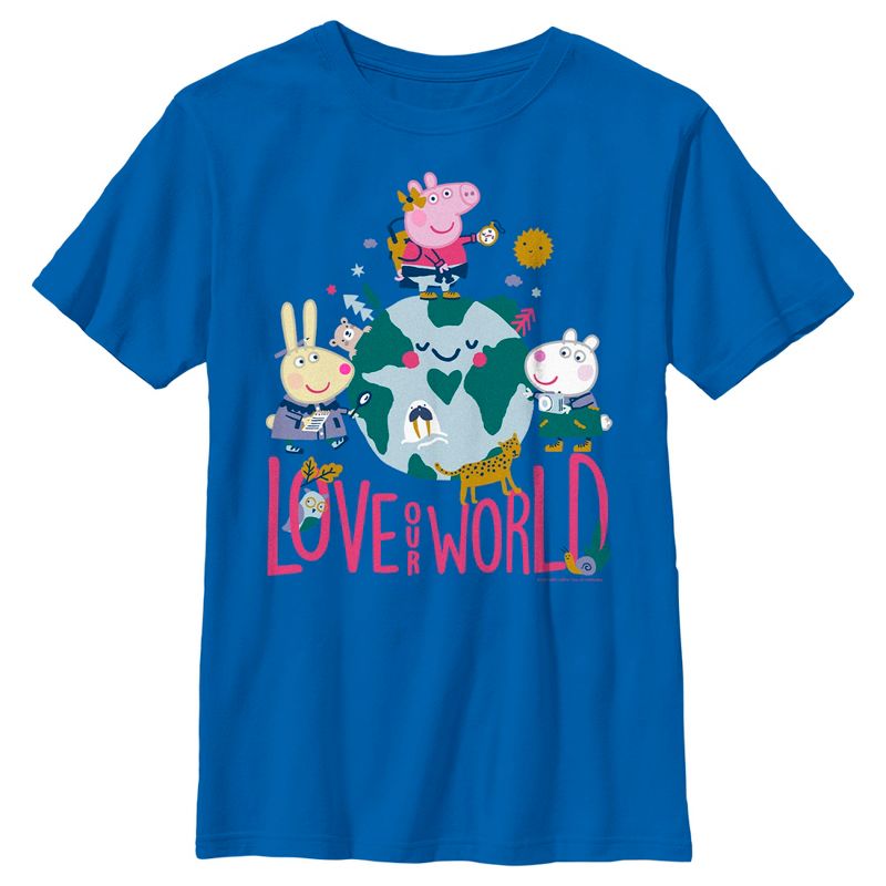 - تباهَ بجمالك مع هذا التيشيرت الجديد الأنيق للأولاد بمناسبة يوم الأرض، وهو مثالي للانطلاق في البرية! يُظهر بيبا بيغ، وريبيكا رابيت، وسوزي شيب، محاطين بالأشجار والحيوانات الأخرى، مع عبارة "أحبوا عالمنا".