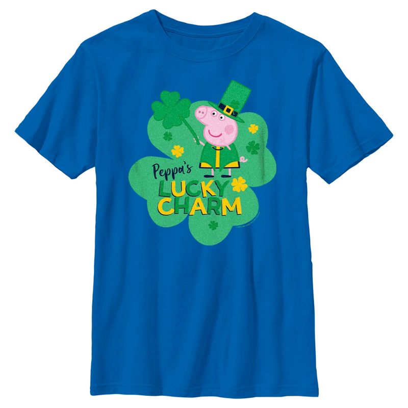 - تباهَ بملابسك الأنيقة مع هذا القميص الجديد للأولاد، مثالي لعيد القديس باتريك! يظهر فيه بيبا بزيّ قزمٍ يحمل زهرة برسيمٍ رباعية الأوراق.