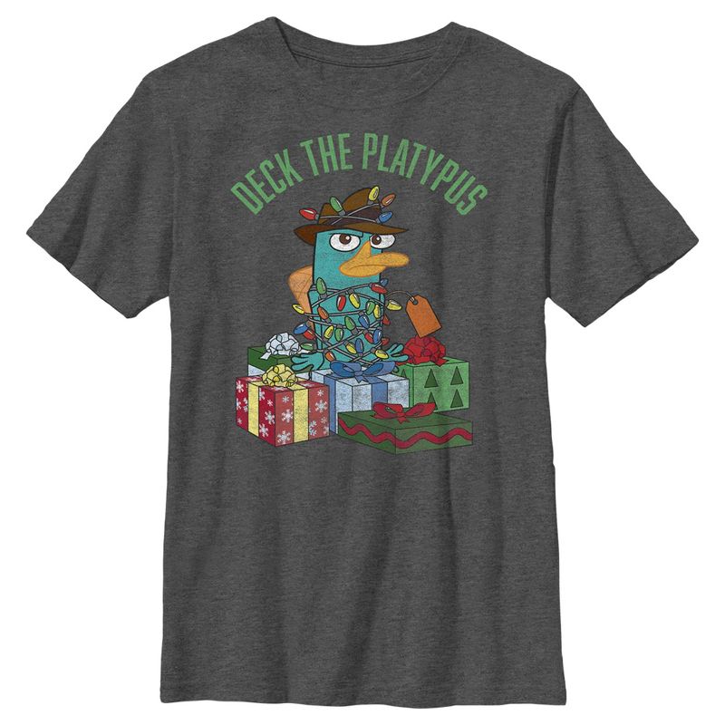 أهلاً فيرب، أعرف ما سنفعله اليوم! سنرتدي هذا التيشيرت المرخص رسميًا من ديزني، والمُصمم برسومات فينياس وفيرب "ديك بلاتيبس"! يتميز هذا التصميم للأولاد بشخصية بيري بلاتيبس ملفوفة بأضواء عيد الميلاد ومحاطة بالهدايا. بالتأكيد لن تُقبض عليك كانديس وأنت ترتدي هذا التيشيرت الجديد الرائع يوم عيد الميلاد!
