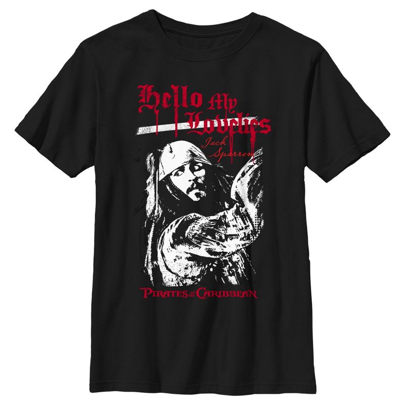 - تباهَ بأزيائكَ الأنيقة مع هذا التيشيرت الجديد للأولاد، مثالي لكل المناسبات! يتميز برسوماتٍ بالأبيض والأسود للكابتن جاك سبارو، إلى جانب اسمه وعبارة "أهلاً يا أحبائي" بأحرف حمراء.