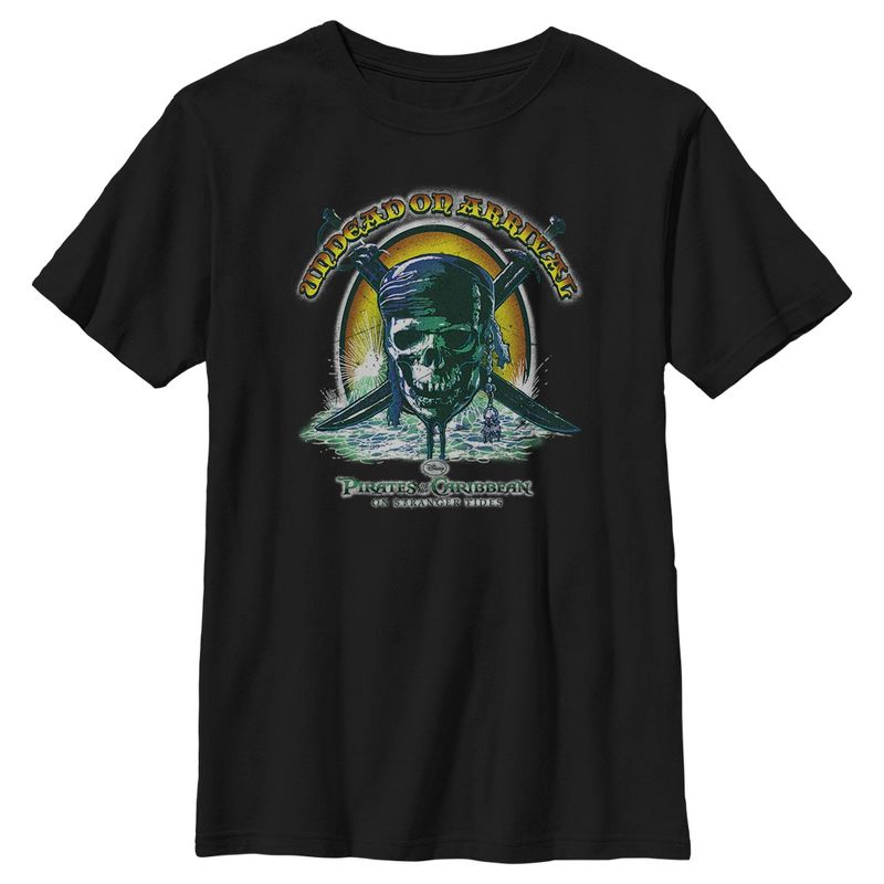- تباهَ بأزيائكَ الأنيقة مع هذا التيشيرت الجديد للأولاد، مثالي لكل مناسبة! يحمل عبارة "Undead on Arrival" فوق شعار جمجمة فيلم "قراصنة الكاريبي: في مدٍّ غريب".