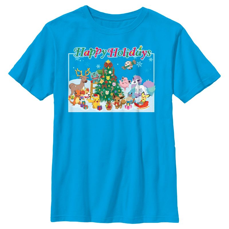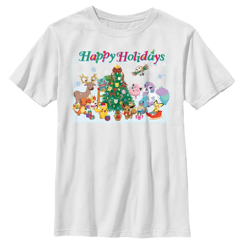 - تباهَ بأزيائكَ الأنيقة مع هذا التيشيرت الجديد للأولاد، مثاليٌّ للأعياد! يحمل عبارة "أعياد سعيدة" أسفل رسمٍ لشخصيات بولباسور، تشارمندر، ديلي بيرد، إيفي، فينيكين، جيغليبوف، بيتشو، بيكاتشو، بونيتا، روليت، سكويرتل، وستانتلر يحتفلون بعيد الميلاد!